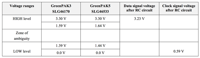 V DD = 3.3 V的電壓下,RC元件之后的輸出電壓將為out = 0.181269·3.3 V≈0.59 V,因此時(shí)鐘脈沖將不會(huì)通過(guò)RC元件。為了進(jìn)行檢查,讓我們將獲得的合成信號(hào)電壓電平與特征邏輯/電壓電平進(jìn)行比較。針對(duì)電源電壓為VDD 0 = 3.3 V的情況進(jìn)行該比較(圖5