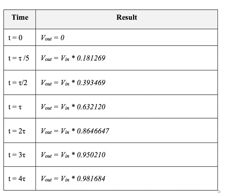 其中τ =時(shí)間常數(shù)。讓我們分析這個(gè)解決方案。在初始時(shí)間t = 0時(shí),當(dāng)輸入脈沖饋入積分元件時(shí),輸出電壓為out = 0,此后Vout  開(kāi)始以與τ值成反比的速度增加,并達(dá)到以下值(圖4
