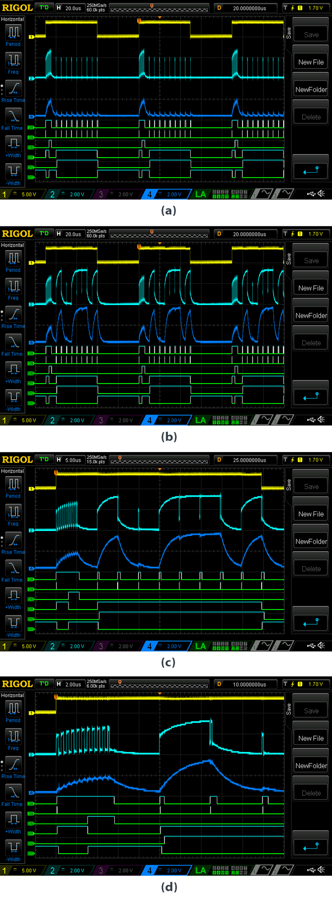 9.這些是“ Receiver_170”接收的示例。通道1(黃色)是CNT2,通道2(淺藍(lán)色)是RC電路之前的外部信號(hào),通道3(品紅色)是RC電路之后的外部信號(hào),通道4(藍(lán)色)是CLK。這些圖像顯示當(dāng)輸入信號(hào)為00000000a),輸入信號(hào)為10010011b),輸入信號(hào)為10010011c)時(shí)以及信號(hào)值較高的單個(gè)周期的縮放視圖(d)。