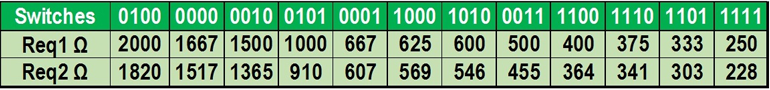 對(duì)于BANK2  對(duì)于R1 = R2 = R4 = R5 = 910Ω,且R 3 = 1100Ω,對(duì)于1100的第一組合 à 364Ω  1001交替組合 à 371Ω; 1101的第一組合 à   303.3Ω1011交替組合 à   321.9Ω。